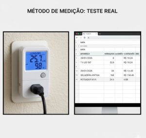 Fase 1 – Medição Base (Semanas 1-2) Conectei o medidor em cada aparelho por no mínimo 72 horas ininterruptas. Isso elimina variações pontuais e dá uma média real de consumo. Para aparelhos que só funcionam sob demanda (como micro-ondas), simulei usos típicos da minha rotina.